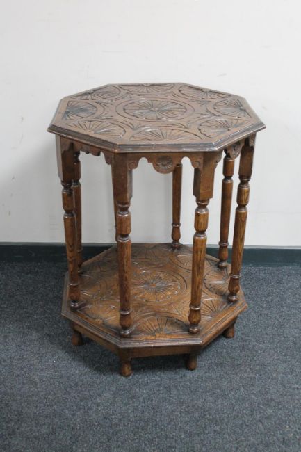 An octagonal carved oak occasional table