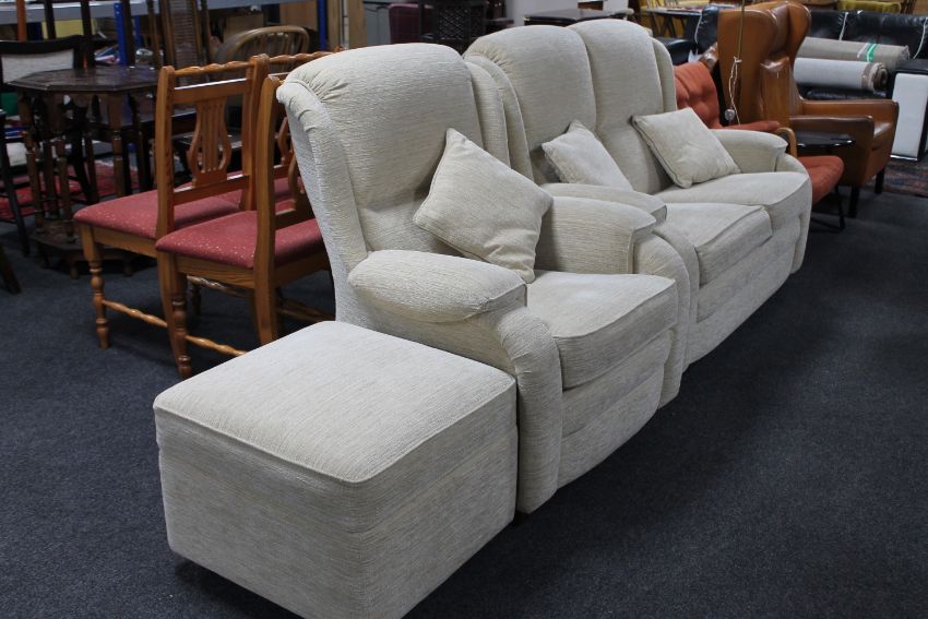 A contemporary three piece lounge suite comprising two seater settee, armchair and footstool