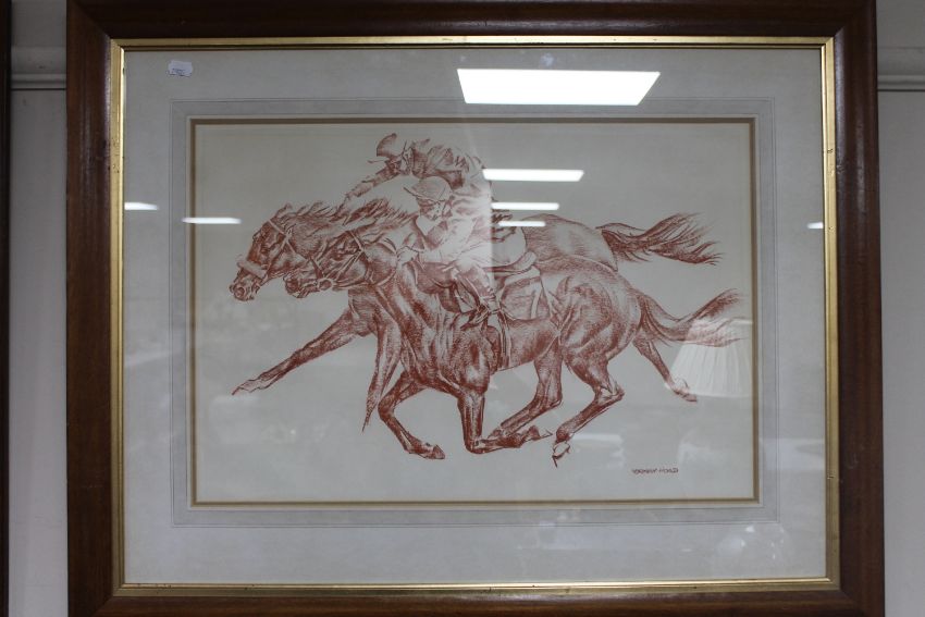 Norman Hoad, Jockeys on horseback, colour chalks, signed