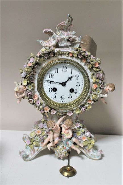 A Meissen four seasons china mantel clock encrusted with flower and cherub decoration with pendulum