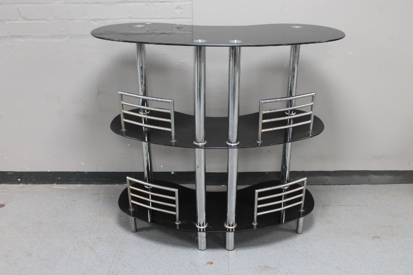 A contemporary black glass and metal three tier bar