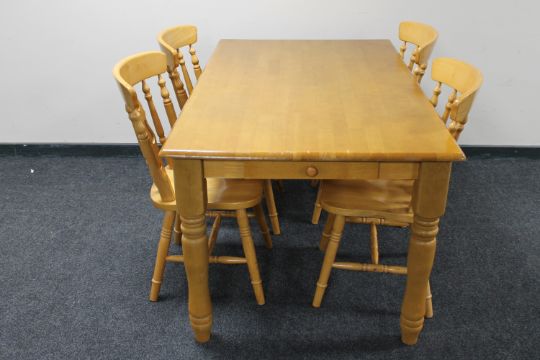 A pine farmhouse style kitchen table fitted with two drawers together with a set of four chairs