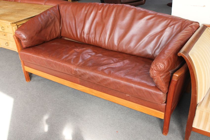 A brown leather three seater settee