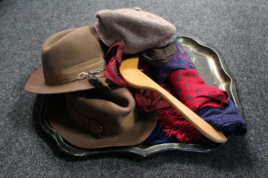 A vintage metal tray of assorted vintage scarves and hats
