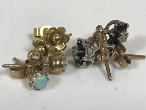 A pair of 9ct gold diamond and sapphire drop earrings, a pair of opal stud earrings, unmarked, and a pair of 9ct gold flower head stud earrings