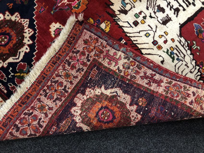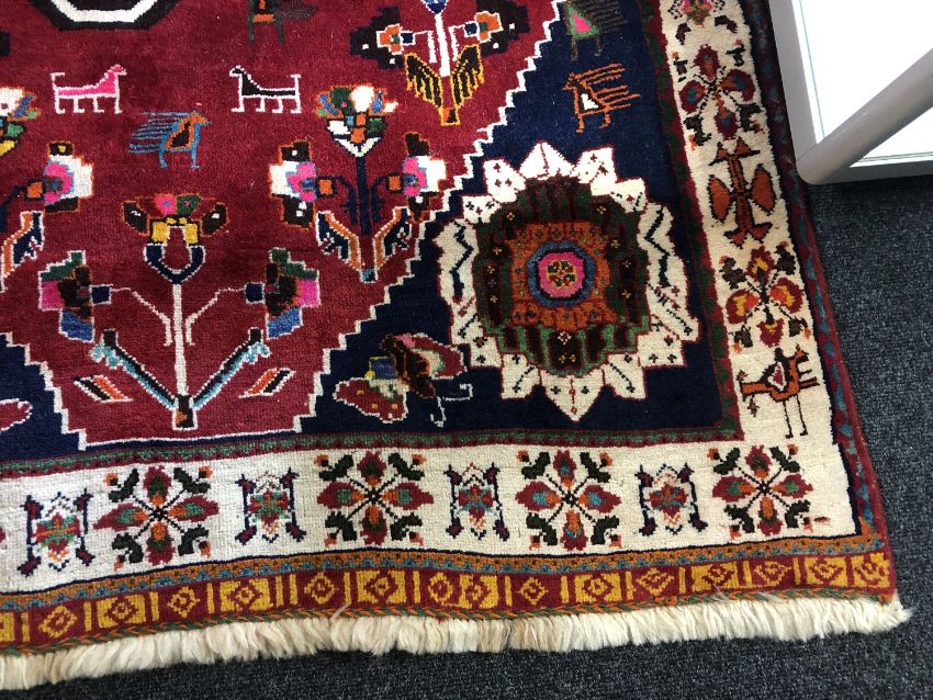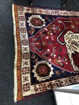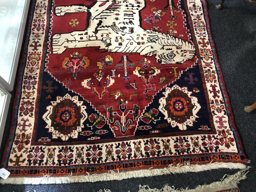 An unusual Kashgai rug, South-West Iran, the crimson field depicting a stylised lion framed by spandrels and ivory borders, 196cm by 123cm