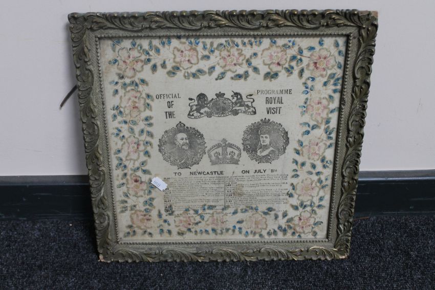 A antique gilt framed handkerchief "the official programme of the Royal visit to Newcastle upon Tyne dated July 11"