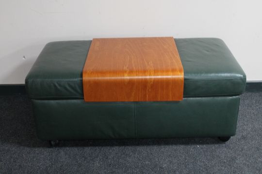 A Ekornes storage green leather double footstool with beech table insert
