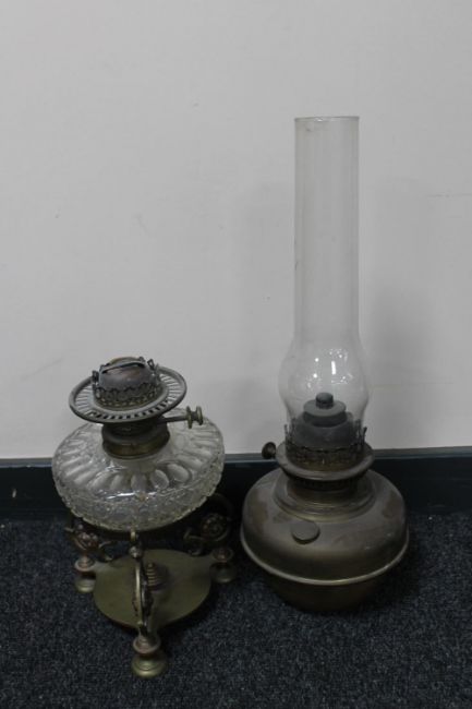 An antique brass Veritas oil lamp with glass chimney and a further glass reservoir oil lamp on a brass stand