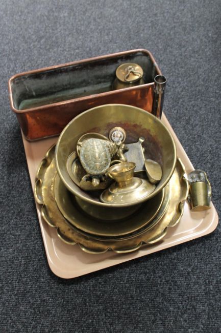 A tray of antique copper trough, brass plates and tray, ornaments etc