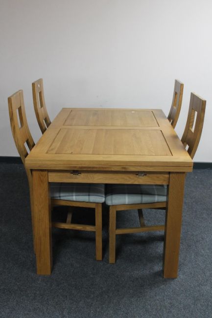 A contemporary oak extending dining table and four high back chairs