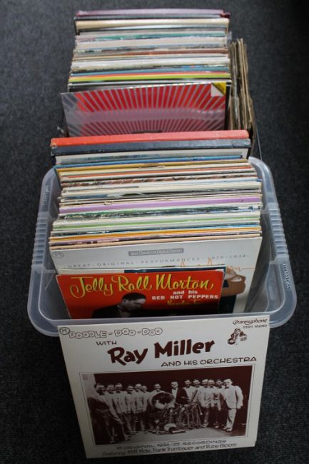 A plastic crate and a basket of LP records mainly classical jazz