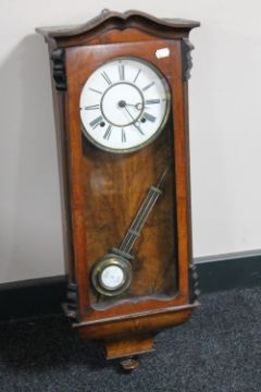 An antique walnut cased eight day wall clock with enamelled dial and pendulum