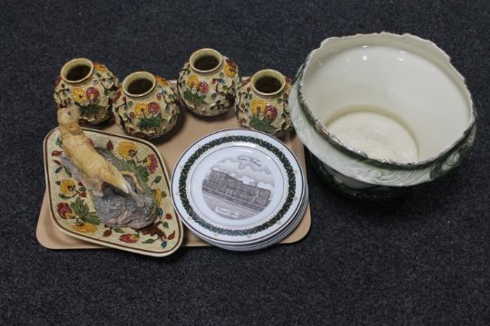 A tray of six Canterbury Collection collector's plates, five Woods Indian Tree pieces, John Beswick studio sculpture of golden retriever, Victorian planter