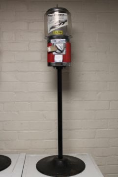 A coin operated jelly bean dispenser on pedestal stand