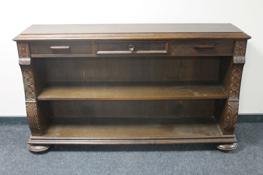 A set of continental oak open shelves on bun feet