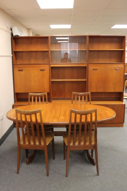 A seven piece teak G Plan dining room suite - twin section display unit, oval extending table and four chairs