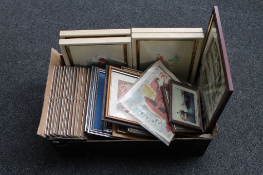 A box of framed golfing prints, picture frames, signed photos of Blyth Harbour, two copies of 2000 AD, assorted prints