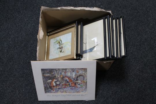 A box of pictures and prints - six colour prints of paddle steamers, two framed Indian prints, watercolour and an unframed signed print entitled Ban blood sports foxy? What shall we do then