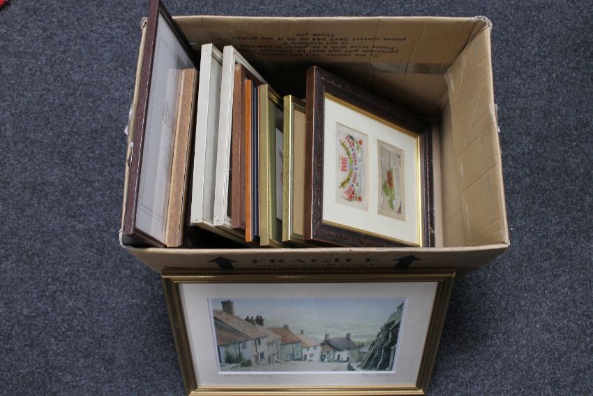 A box of assorted pictures and prints and two WWII era framed silkwork postcards