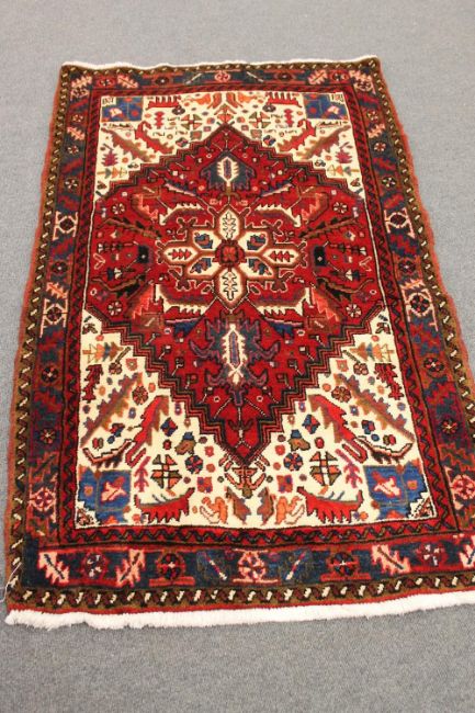 A Heriz rug, the strawberry field centred by a flower head medallion framed by spandrels and plant leaf borders, 167cm by 104cm