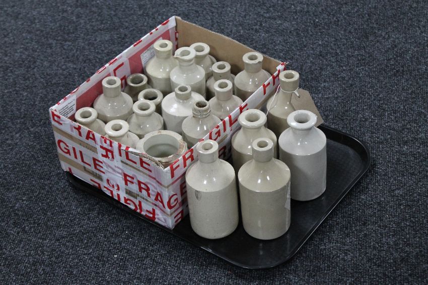 A tray containing twenty approximately antique cream stoneware bottles and jars