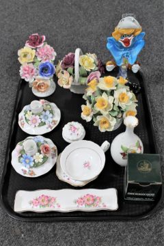 A tray of Murano glass clown, boxed Belleek china basket, Chinese tea cup, pin dishes, China flower posies etc