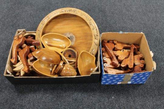 Two boxes of wooden pieces - lazy Susan, pineapple bowls, 3D wooden giraffe jigsaws