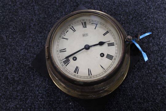 A circular brass cased Sui ship's clock with key mounted on a Bakelite board