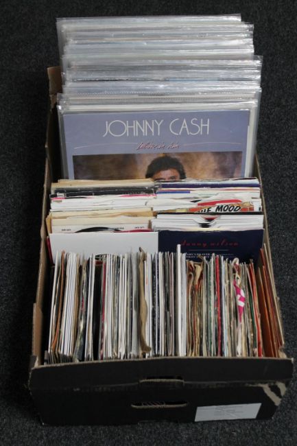 A box of vinyl LP records and 7" singles - Johnny Cash, Walt Disney, Phil Collins etc