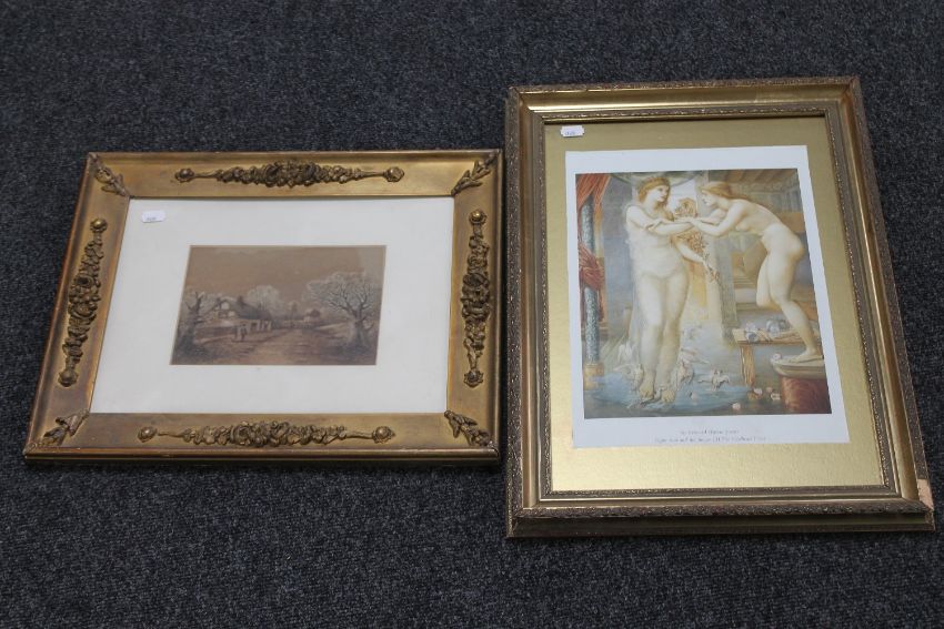 An early 20th century gilt framed watercolour, figures on rural path, and a gilt framed Edward Burne-Jones print