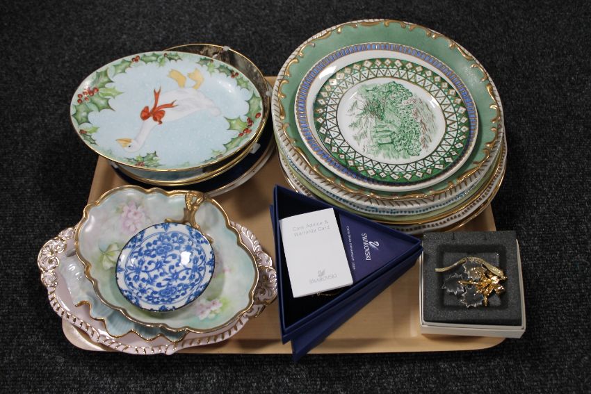 Two boxed Swarovski Christmas ornaments, assorted wall plates, collector's plates and dishes