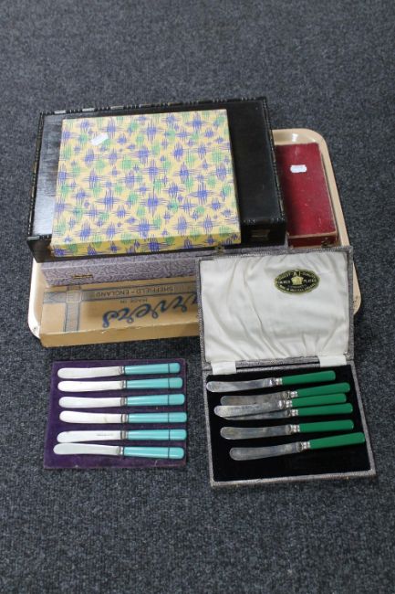 Seven boxes of plated and stainless steel cutlery