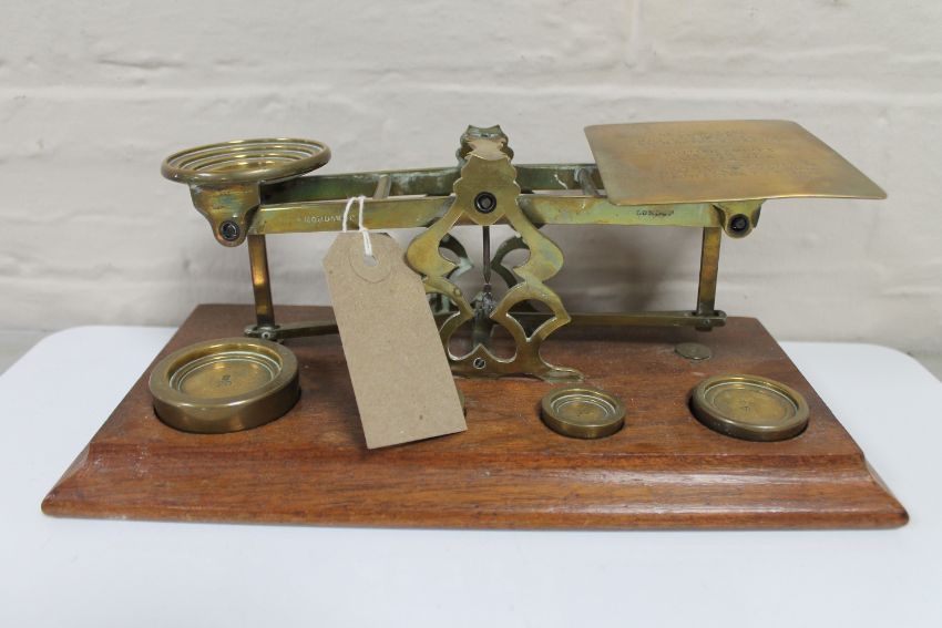 A set of Victorian brass postal scales with weights
