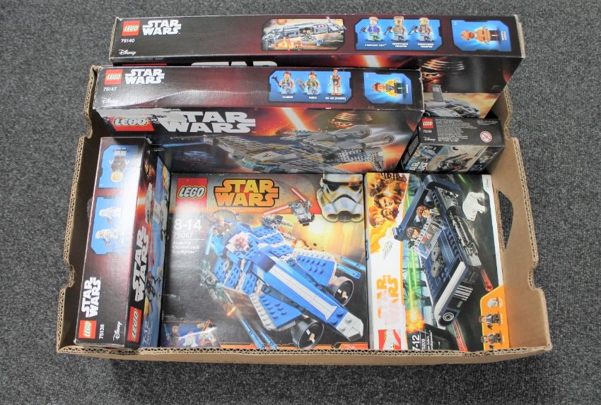 A box of six boxed Lego Star Wars sets - 75140, 75147, 75138, 75087, 75209 and 75161