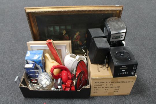 A large gilt framed print and a box of assorted vases, steam iron, picture frames, boxed multi cooker, Russell Hobbs coffee maker and a micro hi/fi system