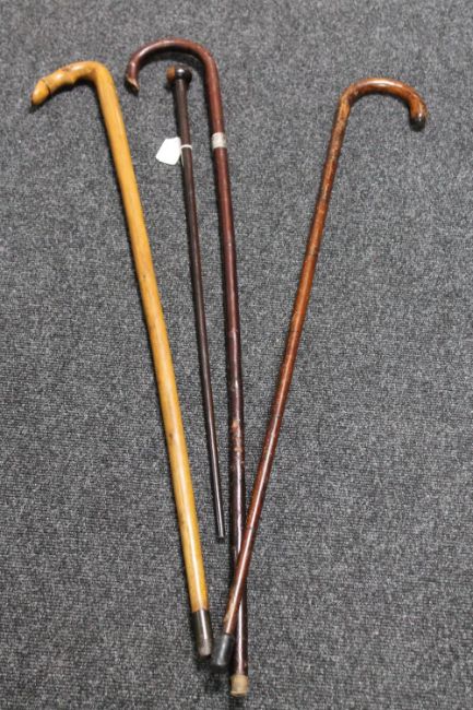 A good collection of walking sticks and an African staff to include one with silver mount. (4)