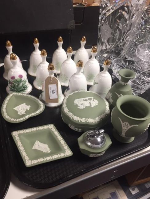 A tray containing a collection of eleven Danbury Mint china bells, six pieces of Wedgwood green and white Jasperware