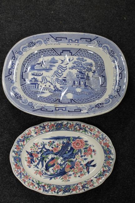 A Victorian blue and white willow patterned Turkey dish together with a further Victorian floral patterned meat plate