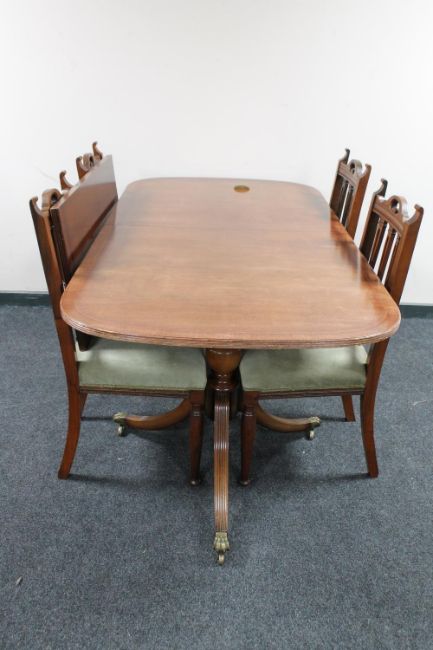 An inlaid mahogany Regency style twin pedestal dining table with leaf together with a set of four Edwardian mahogany dining chairs