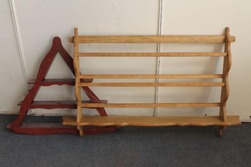 A blonde oak wall shelf and painted triangular wall shelf