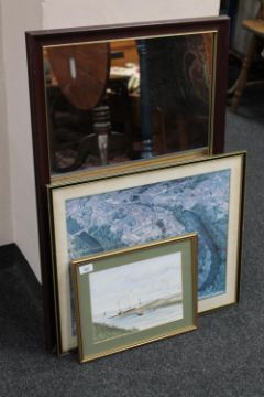 A watercolour of fishing boats, signed M Carter 1991, together with a mirror and two prints