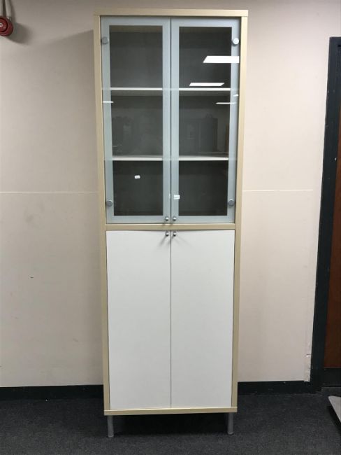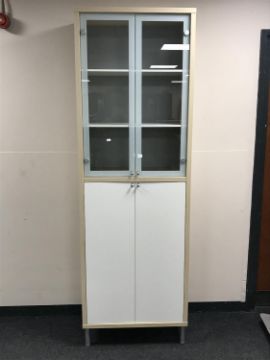 A contemporary Ikea double door display cabinet fitted cupboards beneath