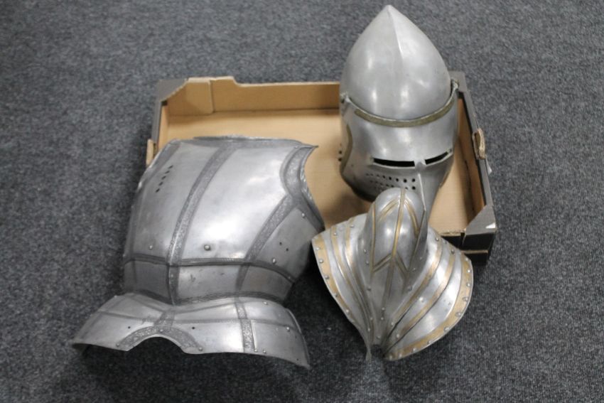 A box of a medieval style helmet, breastplate and codpiece