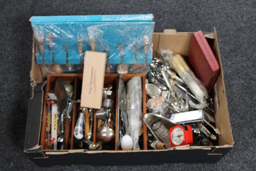 A box of a large quantity of assorted plated and stainless steel cutlery, set of cased butter knives, wine thermometer etc