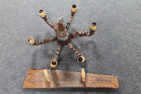 A carved pine six branch chandelier together with a deer's hoof gun rack