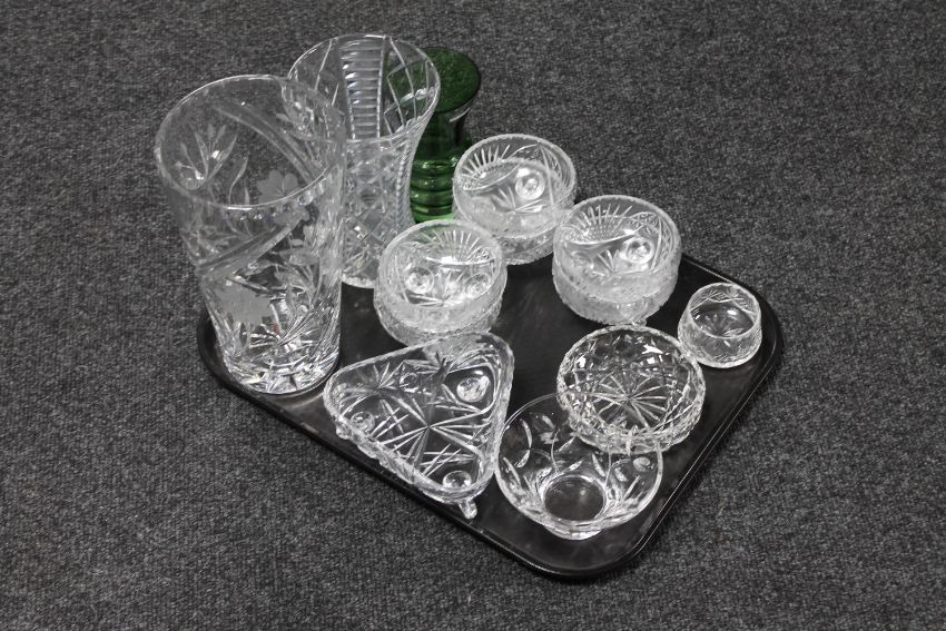 A tray containing assorted glass ware to include vases, sundae dishes, shallow dishes etc