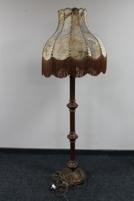 An antique oak standard lamp with an animal hide shade