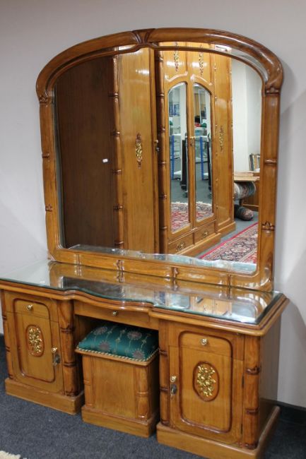 An oriental style parcel gilt kneehole mirror-back dressing table and stool