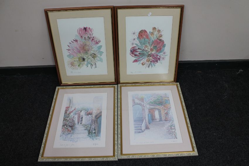 A pair of framed F. Neary signed prints, continental scenes, together with a pair of Janet Bester limited edition prints, still lifes